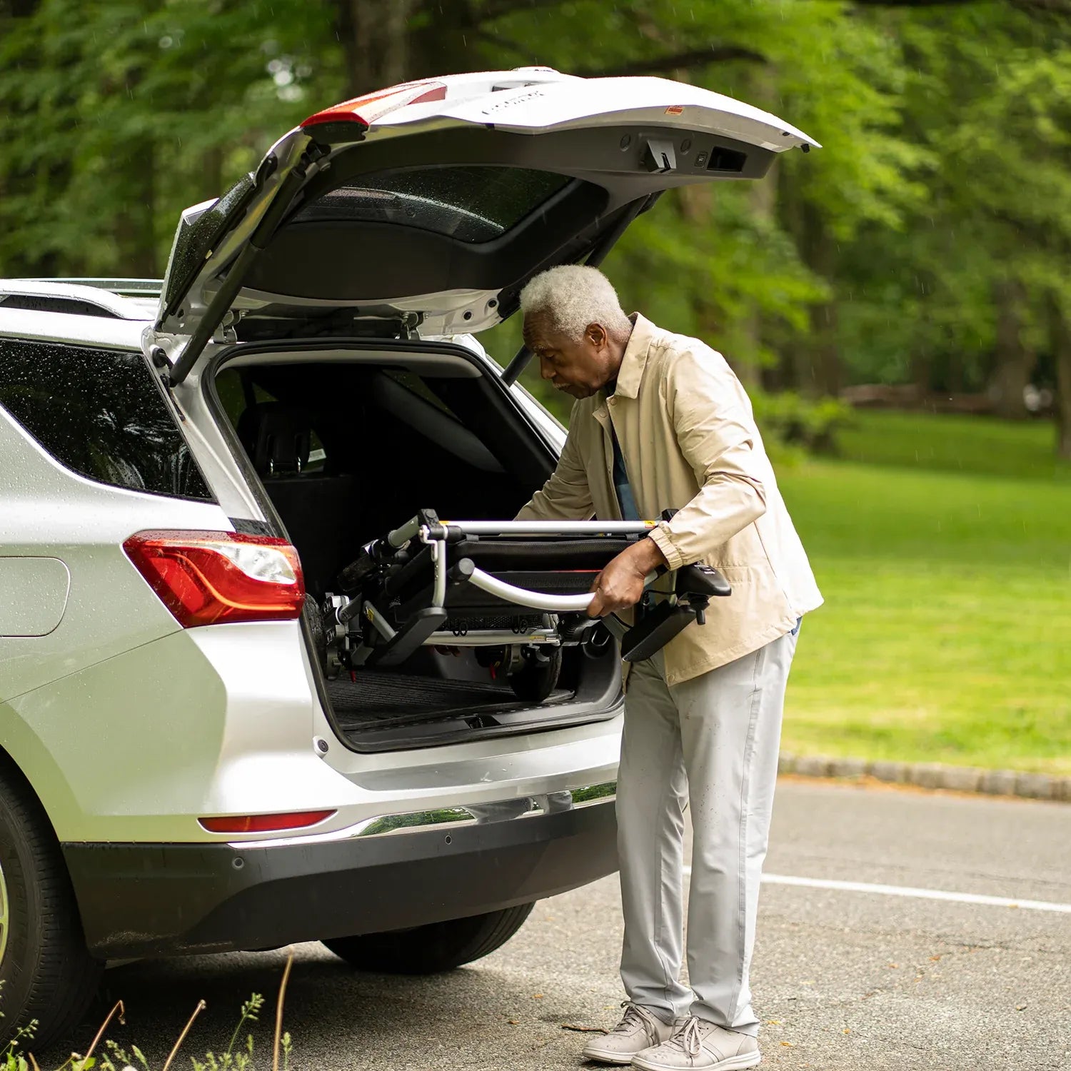 - Easy folding with a single pull release cable; once folded, it fits into the backseat or trunk of a car and can be wheeled like a piece of luggageÂ